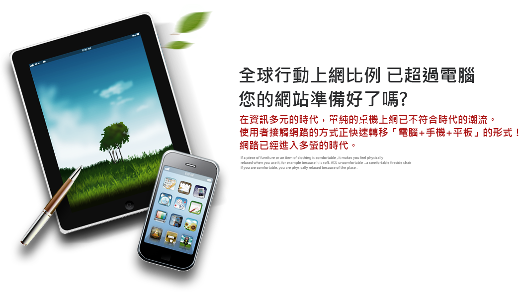採用CSS3/HTML5行動網頁設計最新標準製作,並與現有網頁技術進行整合,打造出專業級的手機版網站,讓您的行網站免去不同作業系統、無法瀏覽或運作的相容性問題。